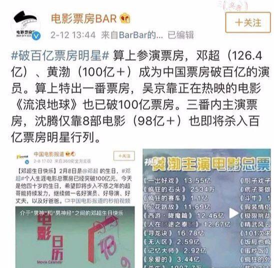 黄渤成首位百亿票房演员 计算方式有误 他们也是百亿票房演员